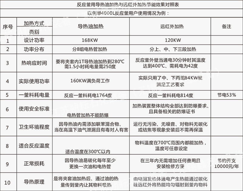 遠紅外電加熱裝置具有加熱面積大,升溫平穩(wěn)而快,放熱均勻,溫度控制方便,可上、中、下分段控制,釜內(nèi)釜壁溫度易控制,運行無噪音,無污染,使用壽命長,節(jié)能好。加熱器溫度可在常溫到800℃范圍內(nèi)設(shè)定。為滿足用戶需求,將加熱設(shè)備又進行改造,使加熱裝置整體達到防爆要求,從而解決了用戶一直擔心且其它加熱方法不能解決的防爆難題。